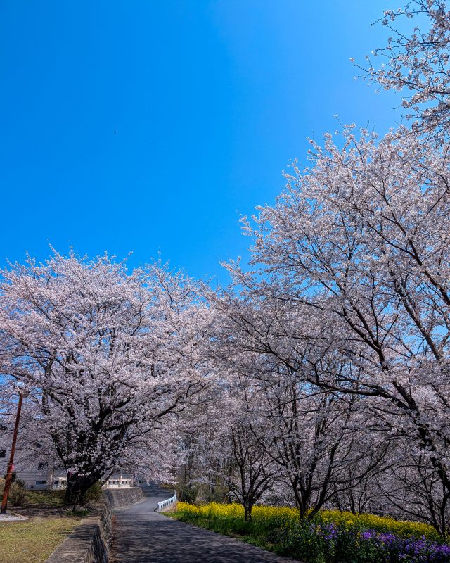 サクラのピンク色、菜の花の黄色、ムラサキハナナの紫色、そして、快晴の青空ブルーのコントラストが美しい。